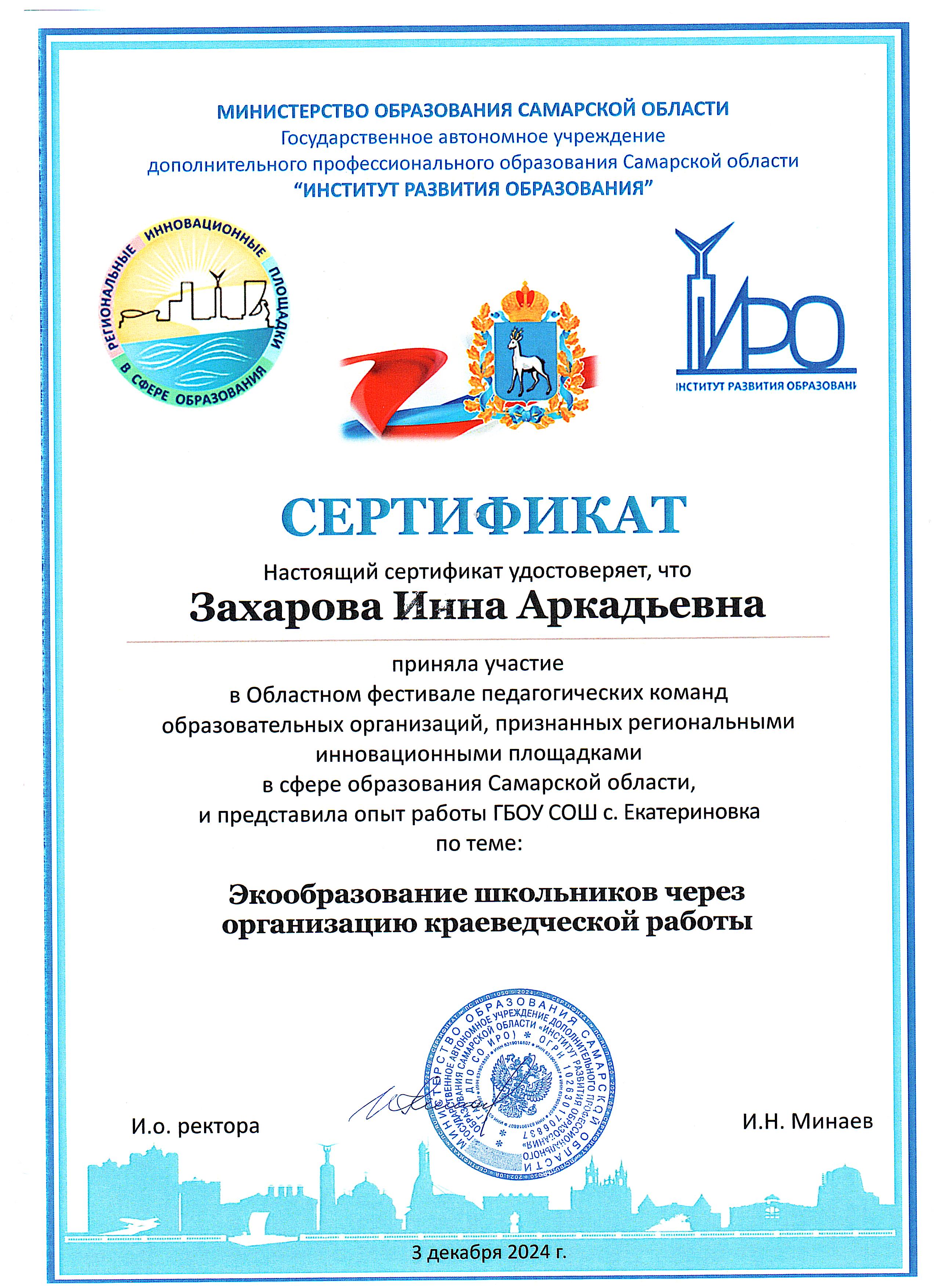 - Приказ министерства образования Самарской области от 15.08.2024 № 610-од «О признании в 2024 году организаций, осуществляющих образовательную деятельность, и иных действующих в сфере образования организаций, а также их объединений, расположенных на территории Самарской области, региональными инновационными площадками в сфере образования»